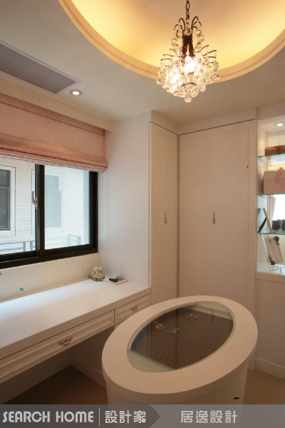 在主臥更衣室的天花板,以圓形切割搭配間接光源,為更衣室妝點出有如精品店VIP室的氛圍,同時借助間接光源的柔和光線,投射出放鬆感且足夠照明的燈光。